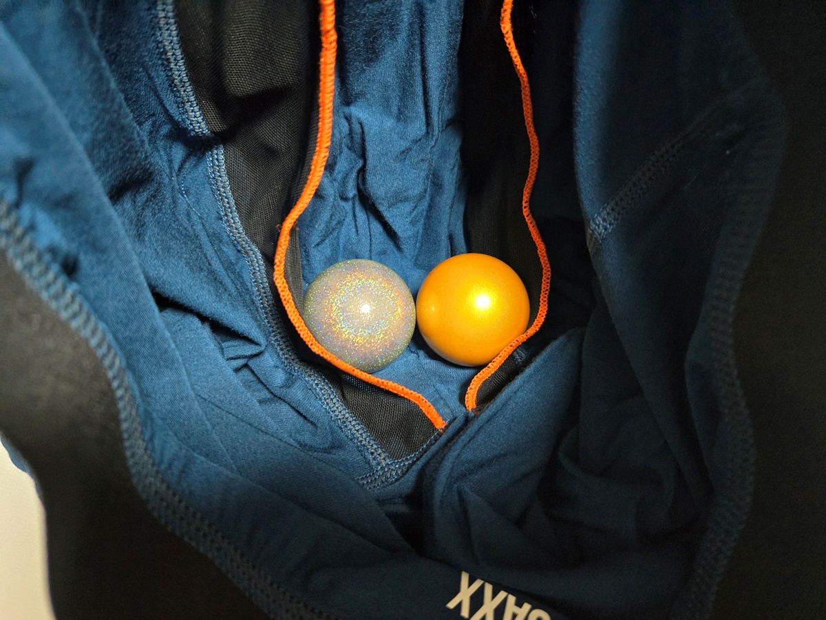 SAXXパンツ下+コンプレッションウェア+SAXXパンツ上というあり得ない構成の上、局部が目立たないようタオルハンカチを入れさせてもらってます。