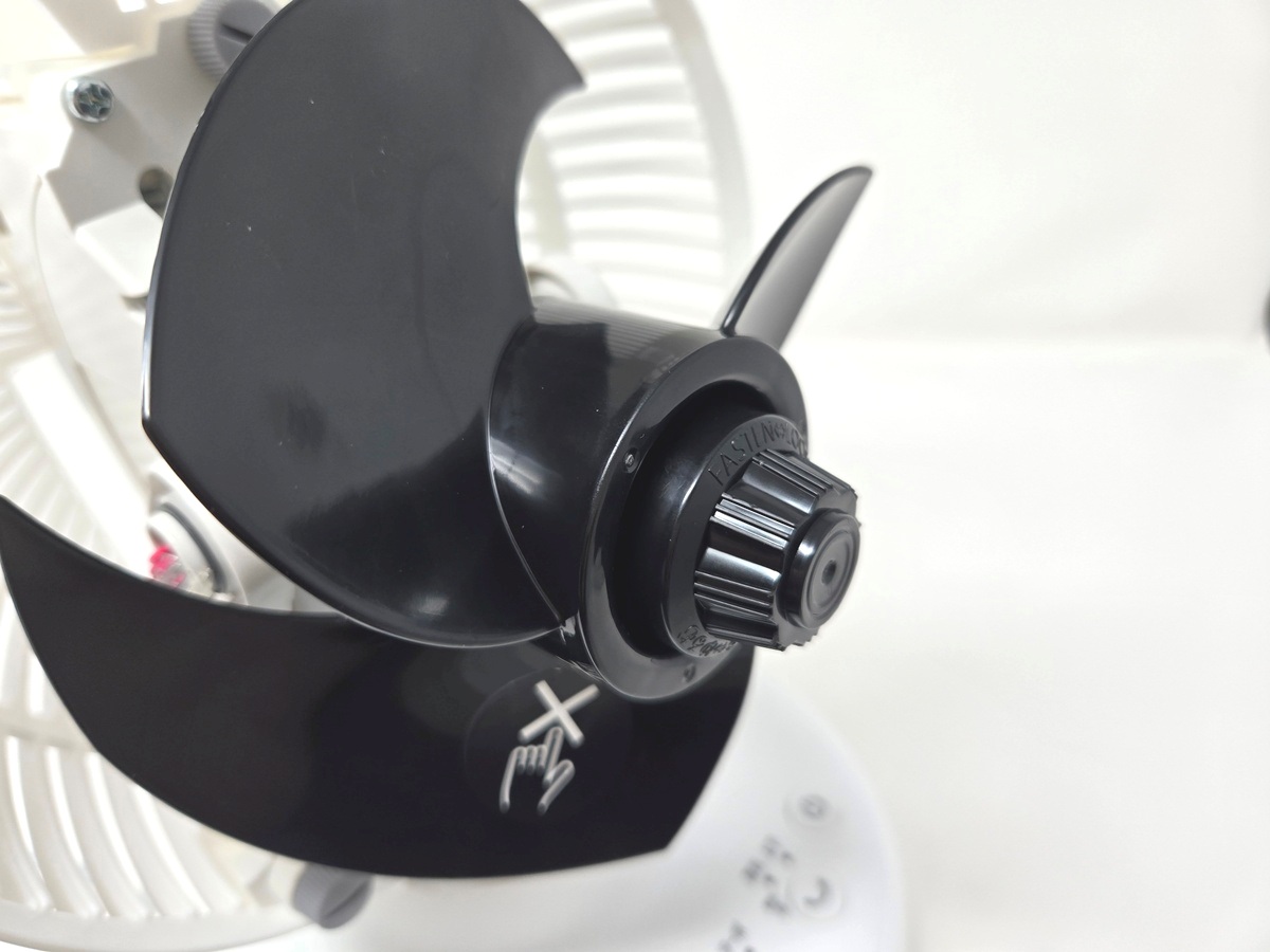 羽は中央の手ネジで、逆ねじ仕様。回す方向が書いてあるので迷わない。