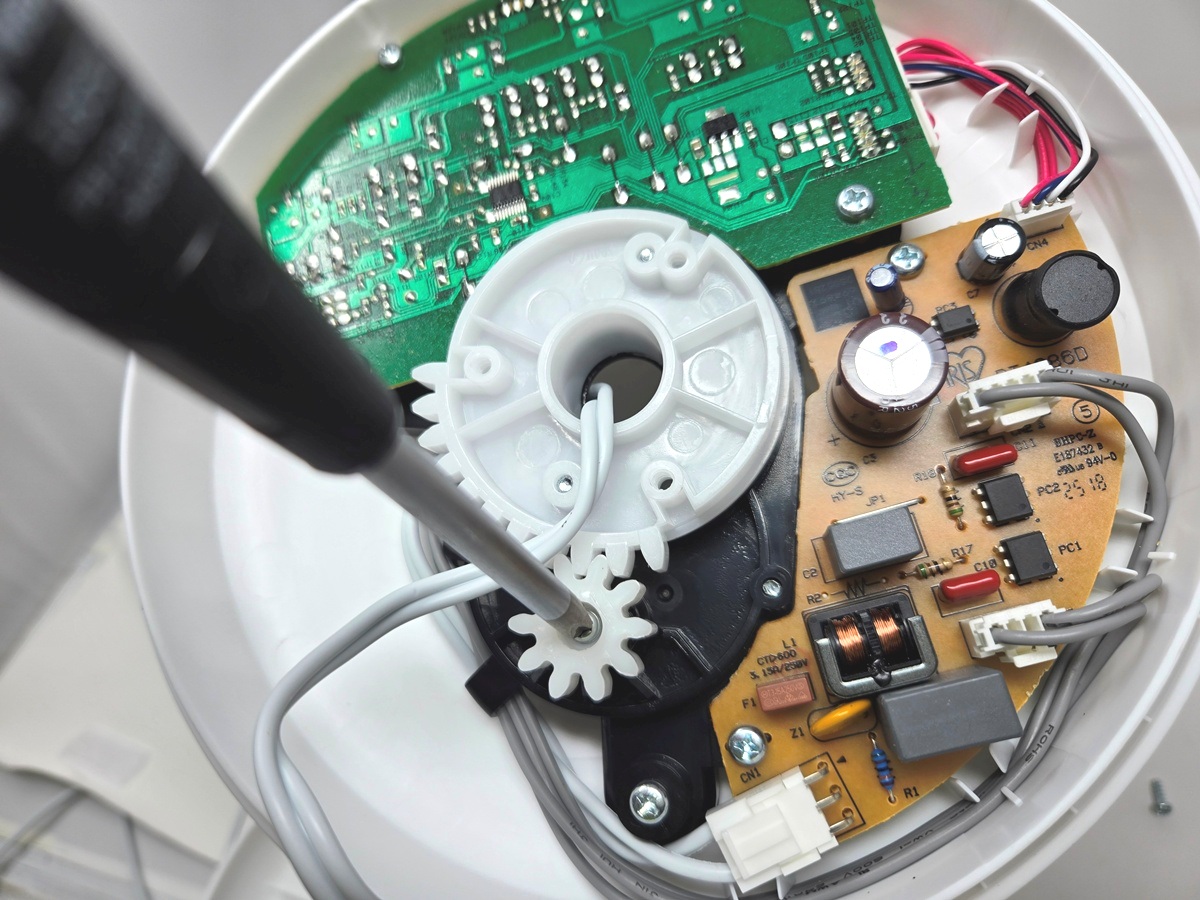 画像のプラスドライバーを刺している左右首振り用プラスチックギア中央のねじが緩むらしい。実際少し緩かった。