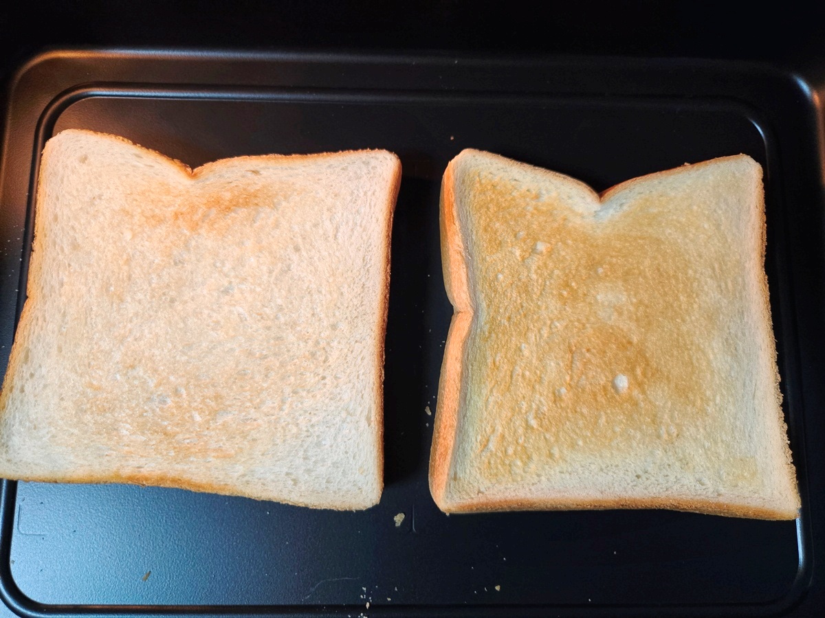 通常メニューで6分!画像が6枚切り食パン、オート焼き具合中間。右が表、左が裏。結構な薄焼き。
