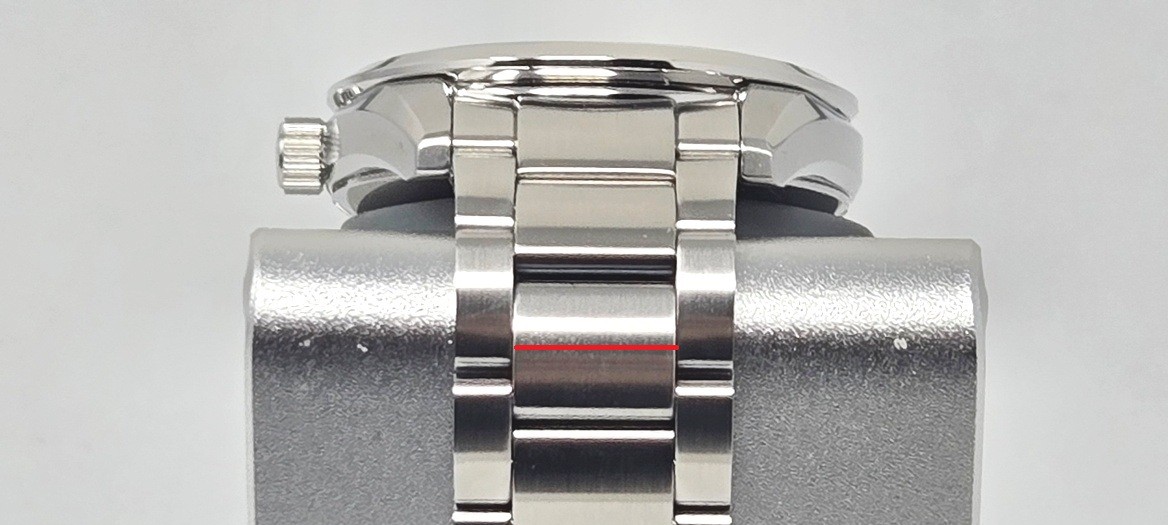 ガラス面から文字盤までの距離はやや広め。また外周リングがポリッシュ仕上げで、インデックスの映り込みが出る仕様。